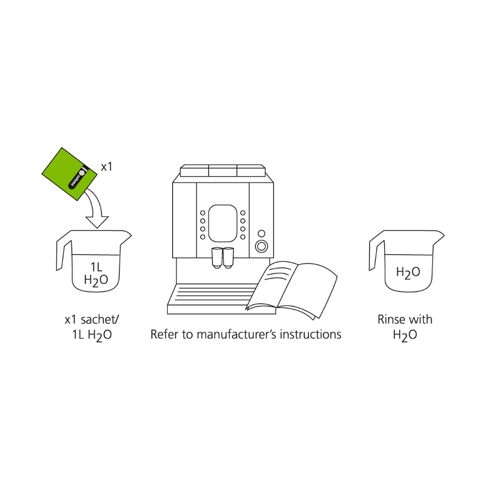 - Dissolve one 25 g sachet in 1 L warm water and pour into the water tank